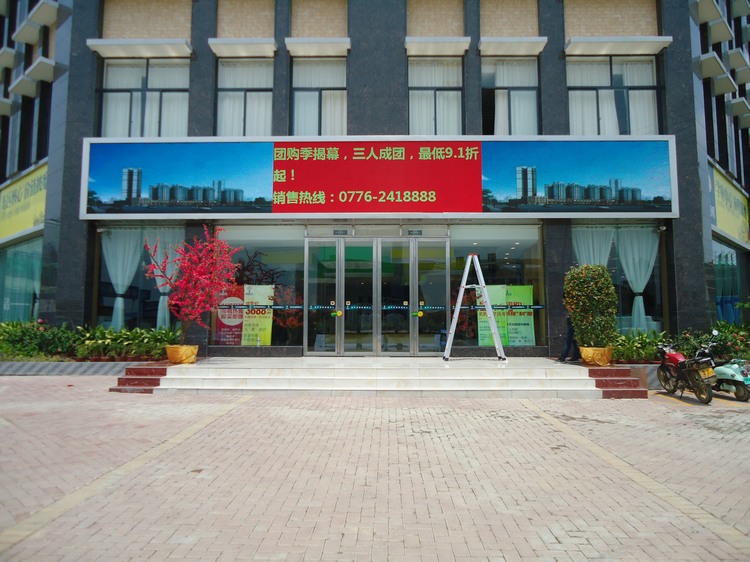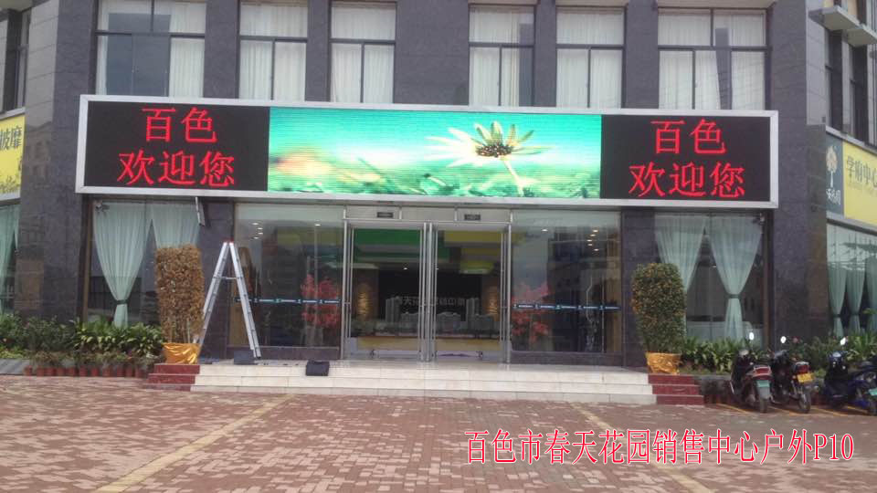 2、案例名稱:項目名稱命名:百色市春天花園銷售部戶外P10全彩LED顯示屏 26平方
